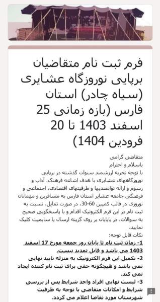 📲 فرم ثبت نام متقاضیان برپایی نوروزگاه عشایری (سیاه چادر) استان فارس (بازه زمانی ۲۵ اسفند ۱۴۰۳ تا ۲۰ فرودین ۱۴۰۴):