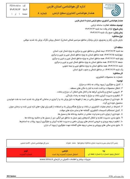 پیرو اعلام هشدار سطح نارنجی اداره کل هواشناسی استان فارس درخصوص بروز پدیده جوی و بارش از اواخر روز سه شنبه مورخ ۱۴۰۳/۱۲/۱۴ تا روز یکشنبه مورخ ۱۴۰۳/۱۲/۱۹، لطفا موارد ذیل را رعایت فرمائید: