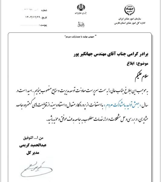 طی حکمی از سوی دکتر کریمی مدیرکل امور عشایر فارس، مهندس بهنام جهانگیرپور بعنوان سرپرست معاون توسعه مدیریت منابع اداره کل امور عشایر فارس منصوب شد.