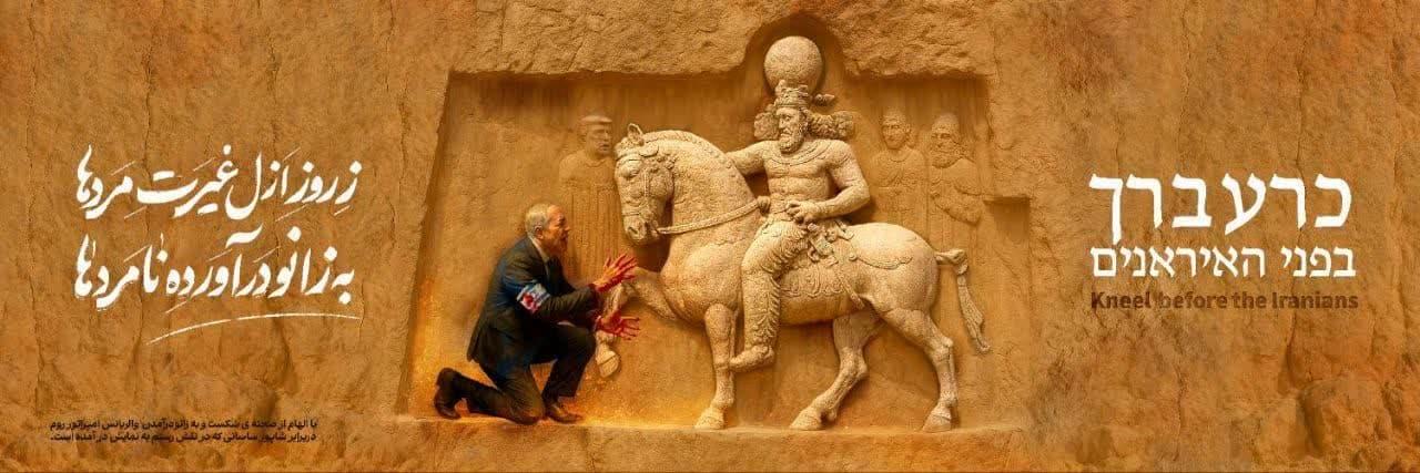 در پی ناکامی و شکست رژیم منحوس صهیونیستی در برابر ملت بزرگ ایران، با الهام از صحنه شکست و به زانو درآمدن والریانس امپراطور روم در برابر شاپور ساسانی که در نقش رستم به نمایش درآمده است؛ از جدیدترین دیوارنگاره میدان امام حسین(ع) شیراز با این تصویر و متن رونمایی شد.