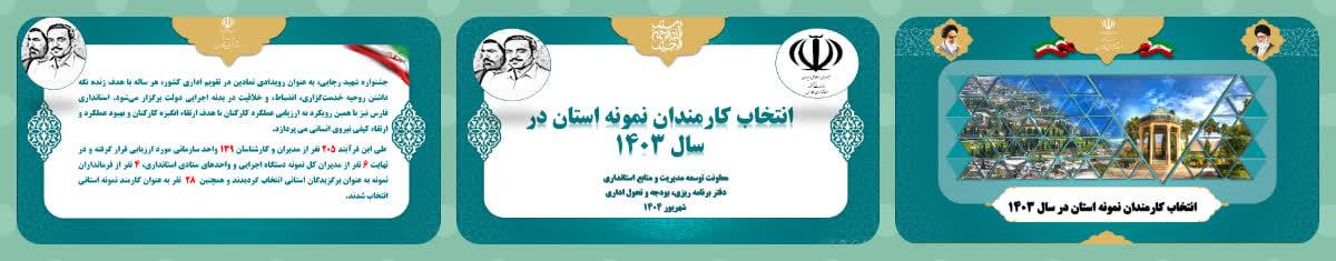 فرایند انتخاب کارمند نمونه، ابتدا به صورت فراخوان عمومی و ارسال شاخصهای اعلامی توسط استانداری فارس به کلیه کارکنان ستادی و شهرستانی و درخواست ارایه مستندات توسط متقاضیان، در اردیبهشت ماه ۱۴۰۴ انجام شد و سپس کارمند برتر دستگاه اجرایی انتخاب و به استانداری فارس معرفی گردید. براساس شاخصهای تعیین شده و بارگذاری مستندات برای هر کدام از شاخصها در سامانه طراحی شده توسط استانداری فارس و امتیازدهی توسط شورای انتخاب کارمند نمونه استانداری (شامل معاون توسعه مدیریت، معاون سیاسی و اجتماعی، مدیرکل بازرسی و مدیریت عملکرد، مدیرکل حراست، مدیر کل و کارشناسان دفتر تحول اداری و آموزش و پژوهش)، فرد برتر انتخاب شده است.